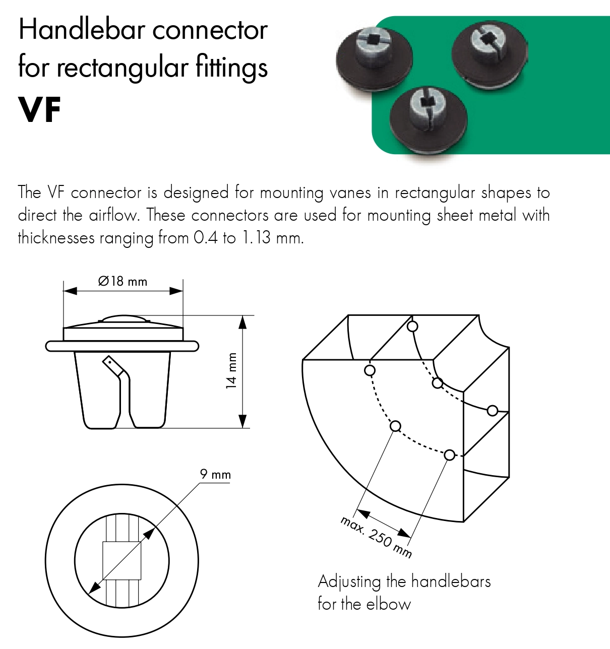 The VF connector is designed for mounting vanes in rectangular shapes to direct the airflow.