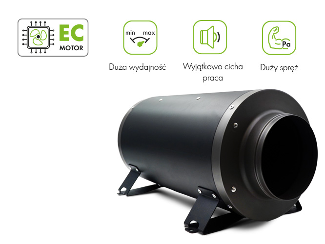 Wentylator wyposażony jest w energooszczędny silnik elektryczny komutowany elektronicznie (EC). Dzięki zastosowaniu silnika EC wentylator osiąga wysoką sprawność i niski pobór mocy przy pełnym zakresie regulacji – co przekłada się na niższe koszty eksploatacyjne.