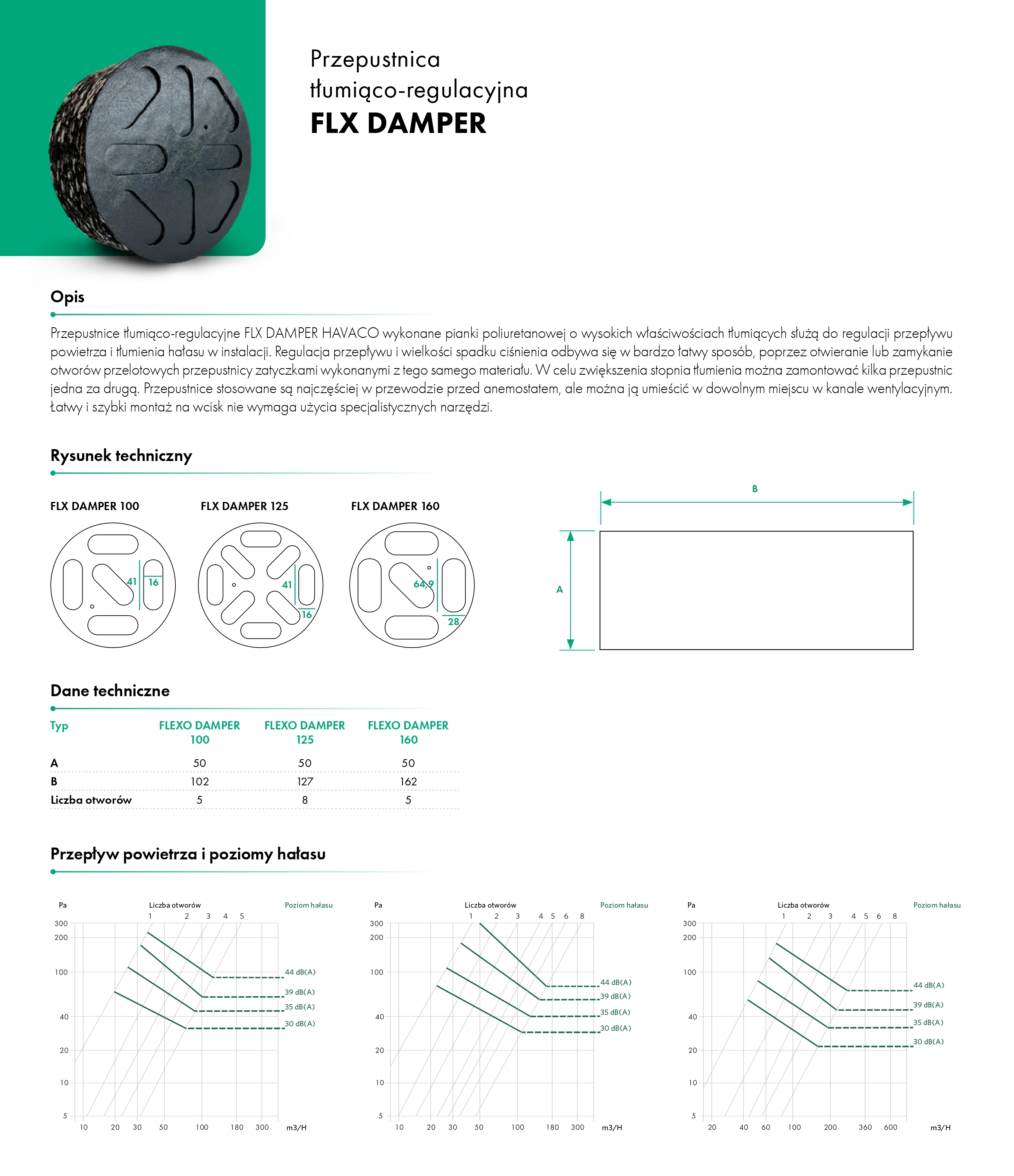 Przepustnice tłumiąco-regulacyjne FLX DAMPER HAVACO wykonane są pianki poliuretanowej o wysokich właściwościach tłumiących służą do regulacji przepływu powietrza i tłumienia hałasu w instalacji.